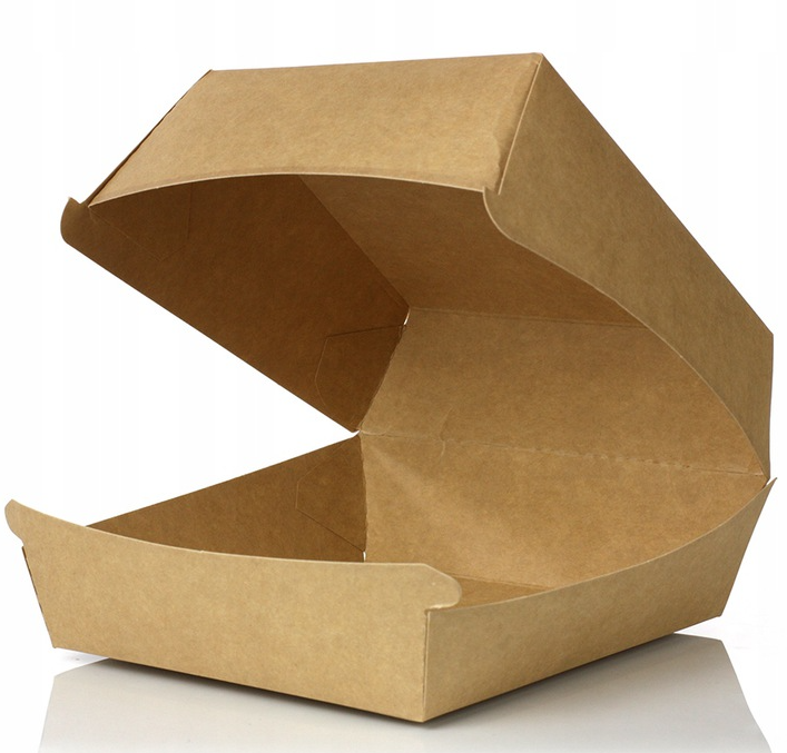 Jednorazowe opakowanie na burgery lub hamburgery na wynos, wykonane z tektury litej o wymiarach 15x15x8 cm
