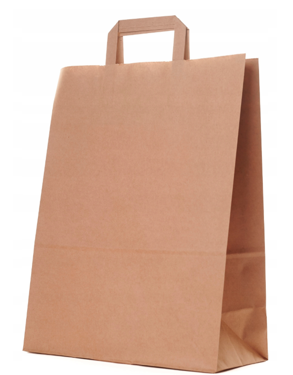 Zapytaj o "Torba papierowa DUŻA ZAKUPOWA brązowa catering dietetyczny płaski uchwyt 32x16x42 cm KARTON 250 szt"