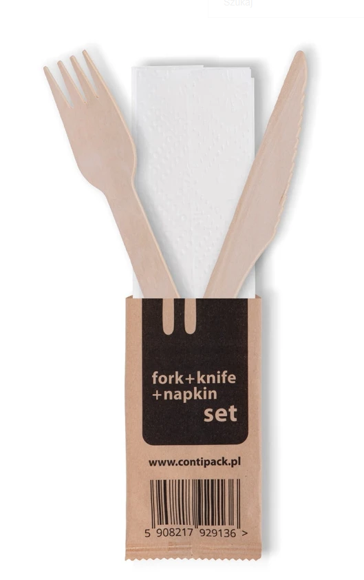 Zestaw sztućców drewniany widelec + nóż + serwetka w papierku 250 szt