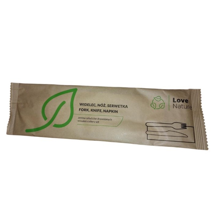 Zestaw sztućców drewniany widelec + nóż + serwetka w papierku 250 szt